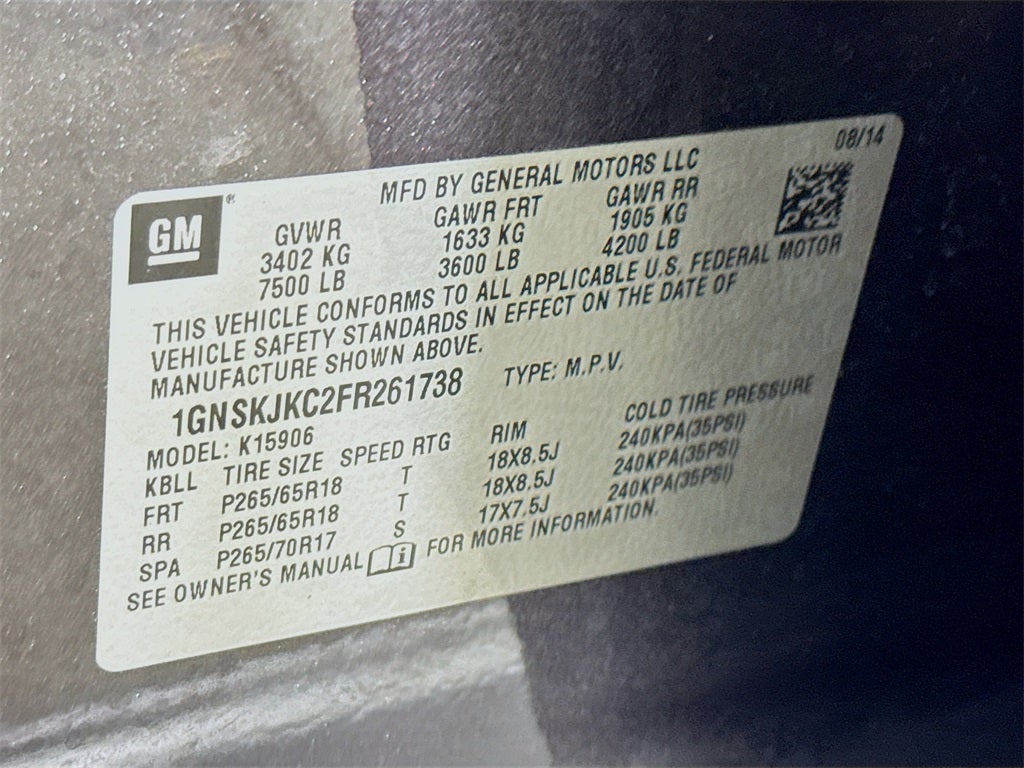 2015 Chevrolet Suburban LT 18 x 8.5 Aluminum Wheels, 2nd Row 60/40 Split-Folding Manual Bench, 3.08 Rear Axle Ratio, 3rd Row Manual 60/40 Split-Folding Fold Flat Bench, 3rd row seats: split-bench, 4-Wheel Disc Brakes, 9 Speakers, ABS brakes, Adjustable pedals, Air Conditioning, Alloy wheels, AM/FM radio: SiriusXM, Auto-dimming door mirrors, Auto-Dimming Inside Rear-View Mirror, Auto-dimming Rear-View mirror, Automatic temperature control, Bose Premium Audio System Feature, Brake assist, Bumpers: body-color, CD player, Compass, Delay-off headlights, Driver & Front Passenger Airbags, Driver door bin, Driver vanity mirror, Dual front impact airbags, Dual front side impact airbags, Electronic Stability Control, Emergency communication system: OnStar Directions & Connections, Extended-Range Remote Keyless Entry, Exterior Parking Camera Rear, Floor Console w/Storage Area, Forward Collision Alert Sensor Indicator, Front anti-roll bar, Front Bucket Seats, Front Center Armrest, Front dual zone A/C, Front reading lights, Front wheel independent suspension, Fully automatic headlights, Garage door transmitter, Heated door mirrors, Heated Front Reclining Bucket Seats, Heated front seats, Heavy-Duty Locking Rear Differential (DISC), Illuminated entry, Lane Departure Warning & Safety Alert Seat, Leather-Appointed Seat Trim, Low tire pressure warning, Memory seat, Memory Settings, Occupant sensing airbag, OnStar w/4G LTE, Outside temperature display, Overhead airbag, Overhead console, Panic alarm, Passenger door bin, Passenger vanity mirror, Pedal memory, Power door mirrors, Power driver seat, Power Liftgate, Power passenger seat, Power steering, Power windows, Power-Adjustable Accelerator & Brake Pedals, Preferred Equipment Group 1LT, Premium Smooth Ride Suspension Package, Radio: Chevrolet MyLink AM/FM Stereo w/CD Player, Radio: Chevrolet MyLink w/Navigation/AM/FM Stereo, Rain sensing wipers, Rear air conditioning, Rear anti-roll bar, Rear Park Assist, Rear reading lights, Rear seat center armrest, Rear window defroster, Rear window wiper, Remote keyless entry, Roof rack: rails only, Security system, Single-Slot CD/MP3 Player, SiriusXM Satellite & HD Radio, Speed control, Speed-sensing steering, Split folding rear seat, Spoiler, Steering wheel mounted audio controls, Tachometer, Telescoping steering wheel, Tilt steering wheel, Traction control, Trip computer, Universal Home Remote, Variably intermittent wipers, Voltmeter.