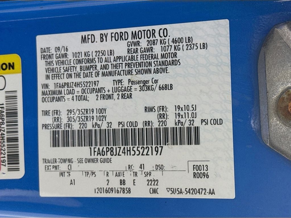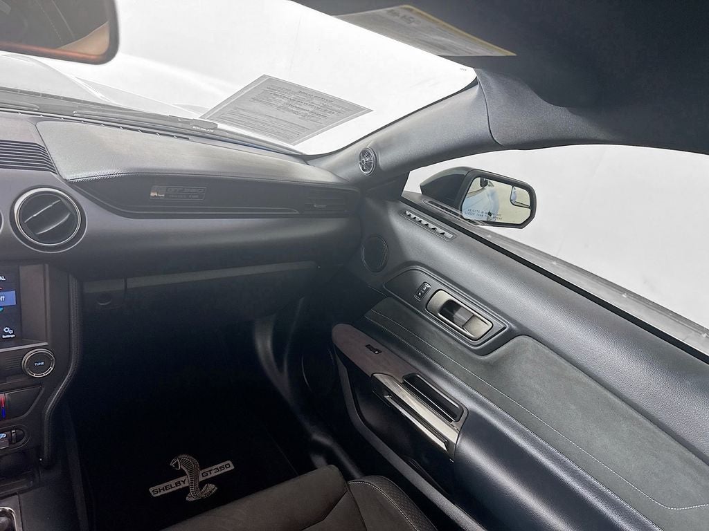 2017 Ford Mustang Shelby GT350 4-Wheel Disc Brakes, 6 Speakers, ABS brakes, Air Conditioning, Alloy wheels, AM/FM radio, AM/FM Stereo & CD Player, AM/FM Stereo/Single CD Player, Auto-dimming Rear-View mirror, Block heater, Brake assist, Bumpers: body-color, Compass, Delay-off headlights, Driver door bin, Driver vanity mirror, Dual front impact airbags, Dual front side impact airbags, Dual-Zone Electronic Automatic Temperature Control, Electronic Stability Control, Electronics Package, Emergency communication system: 911 Assist, Exterior Parking Camera Rear, Four wheel independent suspension, Front anti-roll bar, Front Bucket Seats, Front Center Armrest, Front reading lights, Fully automatic headlights, GT350 Equipment Group 900A, High-Intensity Discharge Headlights, Illuminated entry, Knee airbag, Low tire pressure warning, Occupant sensing airbag, Outside temperature display, Over-the-Top Racing Stripe, Overhead airbag, Overhead console, Panic alarm, Passenger door bin, Passenger vanity mirror, Power door mirrors, Power steering, Power windows, Radio data system, Rear anti-roll bar, Rear window defroster, RECARO Cloth/Miko Suede Sport Seats, Remote keyless entry, Security system, SiriusXM Satellite Radio, Speed control, Speed-sensing steering, Speed-Sensitive Wipers, Split folding rear seat, Spoiler, Sport steering wheel, Steering wheel mounted audio controls, SYNC 3 Communications & Entertainment System, SYNC Communications & Entertainment System, Tachometer, Telescoping steering wheel, Tilt steering wheel, Traction control, Trip computer, Turn Signal Mirrors, Universal Garage Door Opener (UGDO), Variably intermittent wipers, Voice-Activated Touch-Screen Navigation System, Voltmeter, Weathershield Full Vehicle Cover (Dealer Installed), Wheels: 19 x 10.5 Fr/19 x 11 Rr Ebony Black.