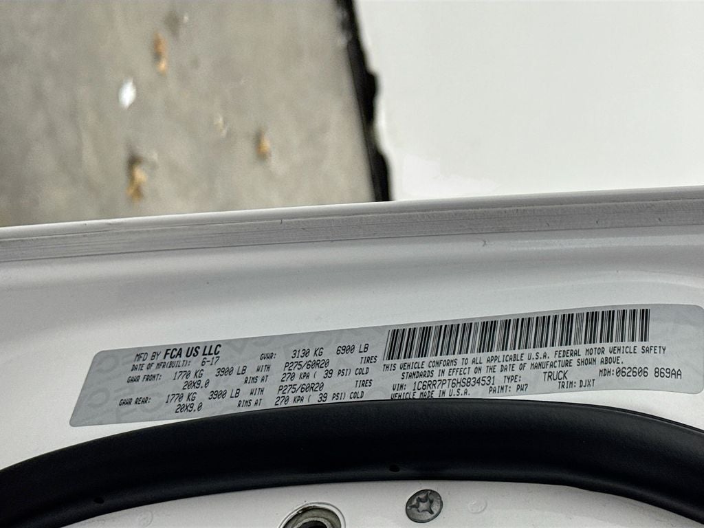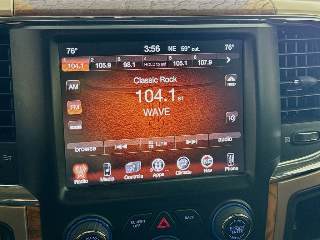 2017 Ram 1500 Laramie Longhorn 1 Yr. Trial (Registration Required), 10 Speakers, 115V Auxiliary Power Outlet, 20 x 9 Polished Aluminum Wheels, 3.21 Rear Axle Ratio, 3.92 Rear Axle Ratio, 4-Corner Air Suspension, 4-Wheel Disc Brakes, 8.4 Touchscreen Display, ABS brakes, Active Grille Shutters, Adjustable pedals, Air Conditioning, Alloy wheels, AM/FM radio, Anti-Spin Differential Rear Axle, Audio Jack Input for Mobile Devices, Audio memory, Auto High-beam Headlights, Auto-dimming door mirrors, Auto-dimming Rear-View mirror, Automatic temperature control, Brake assist, Bright Rotary Shifter, Bucket Seats, Center Hub, Class IV Receiver Hitch, Compass, Delay-off headlights, Driver door bin, Driver vanity mirror, Dual front impact airbags, Dual front side impact airbags, Electronic Shift, Electronic Stability Control, Electronically Controlled Throttle, Emergency communication system: Uconnect Access, Engine Oil Heat Exchanger, Folding Flat Load Floor Storage, Front anti-roll bar, Front Bucket Seats, Front Center Armrest w/Storage, Front dual zone A/C, Front fog lights, Front reading lights, Front wheel independent suspension, Fully automatic headlights, Garage door transmitter, Genuine wood dashboard insert, Genuine wood door panel insert, GPS Antenna Input, GPS Navigation, HD Radio, Heated door mirrors, Heated Front Seats, Heated front seats, Heated rear seats, Heated Second Row Seats, Heated Steering Wheel, Heated steering wheel, Heavy-Duty Engine Cooling, Hemi Badge, High Back Seats, Illuminated entry, Integrated Voice Command w/Bluetooth®, Leather Shift Knob, Leather steering wheel, Low tire pressure warning, Manufacturer's Statement of Origin, Media Hub (USB, AUX), Memory seat, Navigation System, Occupant sensing airbag, Outside temperature display, Overhead airbag, Overhead console, Panic alarm, ParkView Rear Back-Up Camera, Passenger door bin, Passenger vanity mirror, Pedal memory, Power 10-Way Memory Driver & 6-Way Passenger Seats, Power Chrome Trailer Tow Mirrors, Power door mirrors, Power driver seat, Power Lumbar Adjust, Power passenger seat, Power steering, Power windows, Premium Filigree Leather Seats, Protection Group, Quick Order Package 26K Longhorn, Radio data system, Radio: Uconnect 3C Nav w/8.4 Display, Rain sensing wipers, Rear 60/40 Split Folding Seat, Rear anti-roll bar, Rear seat center armrest, Rear step bumper, Remote keyless entry, Remote USB Port, Security system, SIRIUSXM Satellite Radio, SIRIUSXM Traffic, SiriusXM Travel Link, Speed control, Split folding rear seat, Steering Wheel Mounted Audio Controls, Steering wheel mounted audio controls, Tachometer, Tilt steering wheel, Tip Start, Traction control, Trailer Brake Control, Trailer Tow Mirrors & Brake Group, Trip computer, Turn signal indicator mirrors, Uconnect Access, Variably intermittent wipers, Ventilated Front Seats, Ventilated front seats, Voltmeter, Wheel to Wheel Side Steps, Wheels: 20 x 9 Aluminum Polish/Brown Insert.