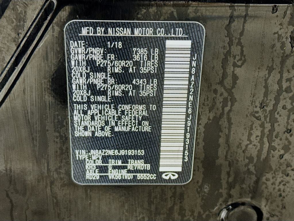 2018 INFINITI QX80 Base 13 Speakers, 2.94 Axle Ratio, 3rd row seats: split-bench, 4-Wheel Disc Brakes, ABS brakes, Air Conditioning, Alloy wheels, AM/FM radio: SiriusXM, Anti-whiplash front head restraints, Auto High-beam Headlights, Auto tilt-away steering wheel, Auto-dimming door mirrors, Auto-dimming Rear-View mirror, Auto-leveling suspension, Automatic temperature control, Backup Collision Intervention (BCI), Blind Spot Intervention (BSI), Blind Spot Warning, Brake assist, Bumpers: body-color, CD player, Delay-off headlights, Driver Assistance Package, Driver door bin, Driver vanity mirror, Dual front impact airbags, Dual front side impact airbags, Electronic Stability Control, Emergency communication system: INFINITI Connection, Four wheel independent suspension, Front anti-roll bar, Front Bucket Seats, Front Center Armrest, Front dual zone A/C, Front fog lights, Front reading lights, Fully automatic headlights, Garage door transmitter: HomeLink, Genuine wood console insert, Genuine wood dashboard insert, Genuine wood door panel insert, Heated door mirrors, Heated Front Bucket Seats, Heated front seats, Heated steering wheel, Illuminated entry, Intelligent Cruise Control (Full-Speed Range), Lane Departure Warning System, Leather Shift Knob, Leather steering wheel, Leather-Appointed Seats w/Stratford Burl Trim, Low tire pressure warning, Memory seat, Navigation System, Occupant sensing airbag, Outside temperature display, Overhead airbag, Overhead console, Panic alarm, Passenger door bin, Passenger vanity mirror, Power door mirrors, Power driver seat, Power Liftgate, Power moonroof, Power passenger seat, Power steering, Power windows, Radio data system, Radio: AM/FM/HD Single In-Dash CD/DVD Player w/MP3, Rain sensing wipers, Rear air conditioning, Rear anti-roll bar, Rear audio controls, Rear reading lights, Rear seat center armrest, Rear window defroster, Rear window wiper, Reclining 3rd row seat, Remote keyless entry, Roof rack: rails only, Security system, Speed control, Speed-sensing steering, Split folding rear seat, Spoiler, Steering wheel memory, Steering wheel mounted audio controls, Tachometer, Telescoping steering wheel, Tilt steering wheel, Traction control, Trip computer, Turn signal indicator mirrors, Variably intermittent wipers, Voltmeter, Wheels: 20 x 8.0 Split 6-Spoke Aluminum-Alloy.