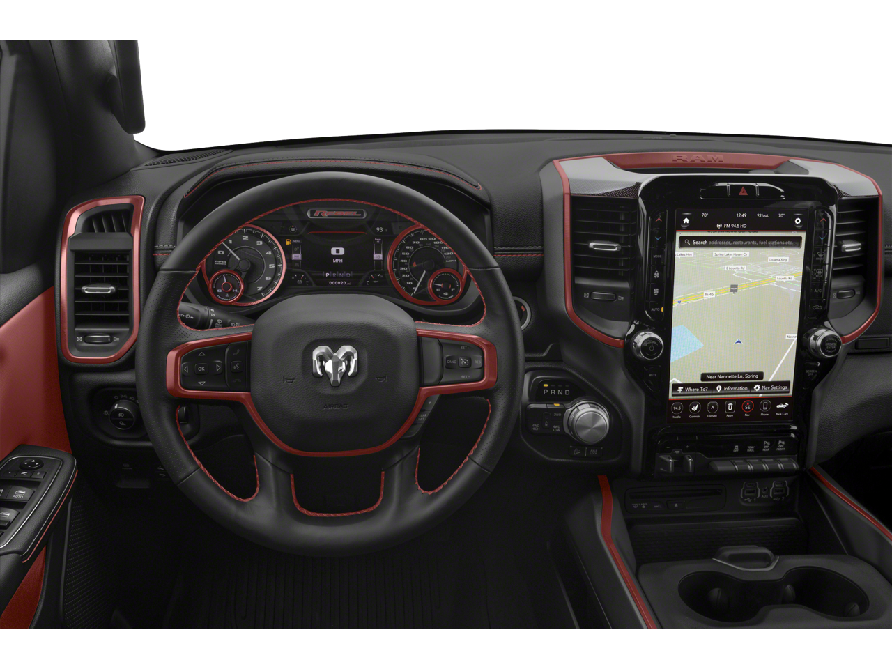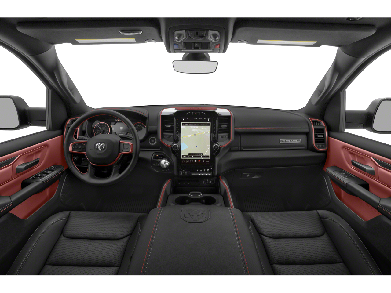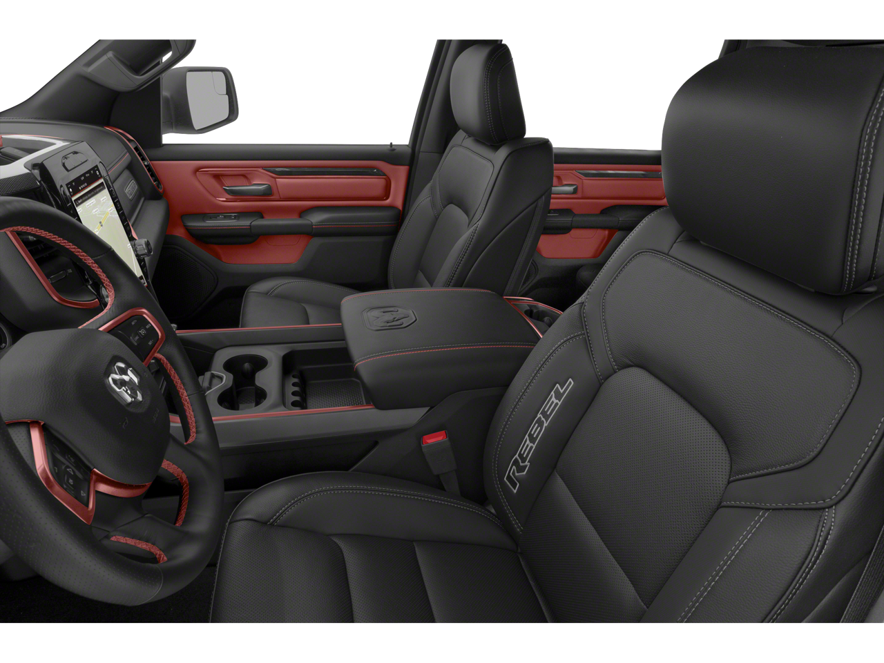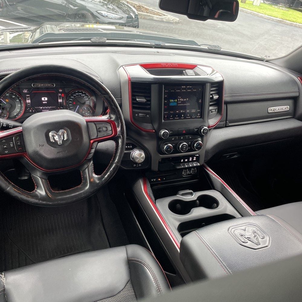 2019 Ram 1500 Rebel 115V Auxiliary Rear Power Outlet, 2 USB Full Function/Charge Only Media Hub, 3.92 Rear Axle Ratio, 33 Gallon Fuel Tank, 4-Wheel Disc Brakes, 48V Belt Starter Generator, 6 Speakers, 8.4 Touchscreen Display, ABS brakes, Air Conditioning, Air Conditioning ATC w/Dual Zone Control, Alloy wheels, AM/FM radio: SiriusXM, Apple CarPlay, Auto-Dimming Exterior Driver Mirror, Auto-Dimming Rear-View Mirror, Body Color Door Handles, Brake assist, Cloth/Vinyl Low Back Bucket Seats, Compass, Delay-off headlights, Driver door bin, Dual front impact airbags, Dual front side impact airbags, Electronic Stability Control, Exterior Mirrors Courtesy Lamps, Exterior Mirrors w/Supplemental Signals, Foam Bottle Insert (Door Trim Panel), Front anti-roll bar, Front Bucket Seats, Front Center Armrest w/Storage, Front fog lights, Front reading lights, Front wheel independent suspension, Fully automatic headlights, Google Android Auto, GPS Antenna Input, Heated door mirrors, Heated Front Seats, Heated Steering Wheel, Illuminated entry, Integrated Center Stack Radio, Leather steering wheel, Low tire pressure warning, Occupant sensing airbag, Outside temperature display, Overhead airbag, Overhead console, Panic alarm, ParkSense Front/Rear Park Assist w/Stop, ParkView Rear Back-Up Camera, Passenger door bin, Passenger vanity mirror, Power Adjustable Pedals, Power door mirrors, Power driver seat, Power Heated Fold Away Mirrors, Power steering, Power windows, Power-Folding Mirrors, Quick Order Package 25W Rebel, Radio data system, Radio: Uconnect 3 w/5 Display, Radio: Uconnect 4 w/8.4 Display, Rain Sensitive Windshield Wipers, RamBox Cargo Management System, Rear anti-roll bar, Rear Dome w/On/Off Switch Lamp, Rear seat center armrest, Rear step bumper, Rear Underseat Compartment Storage, Rear Window Defroster, Rebel Level 2 Equipment Group, Remote keyless entry, Remote Proximity Keyless Entry, Remote Start System, Security Alarm, Single Disc Remote CD Player, SiriusXM Satellite Radio, Speed control, Split folding rear seat, Spray In Bedliner, Steering wheel mounted audio controls, Sun Visors w/Illuminated Vanity Mirrors, Tachometer, Telescoping steering wheel, Tilt steering wheel, Traction control, Trip computer, Universal Garage Door Opener, Variably intermittent wipers, Voltmeter, Wheels: 18 x 8 Painted Black.