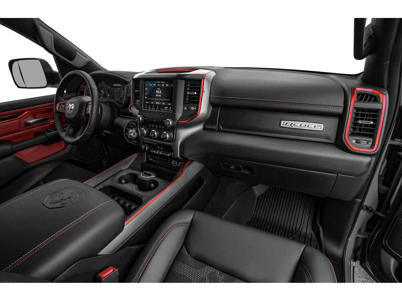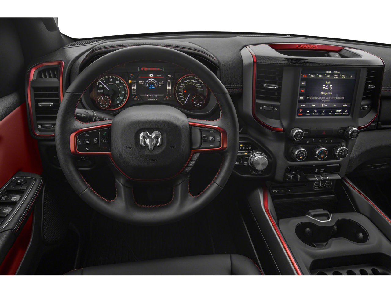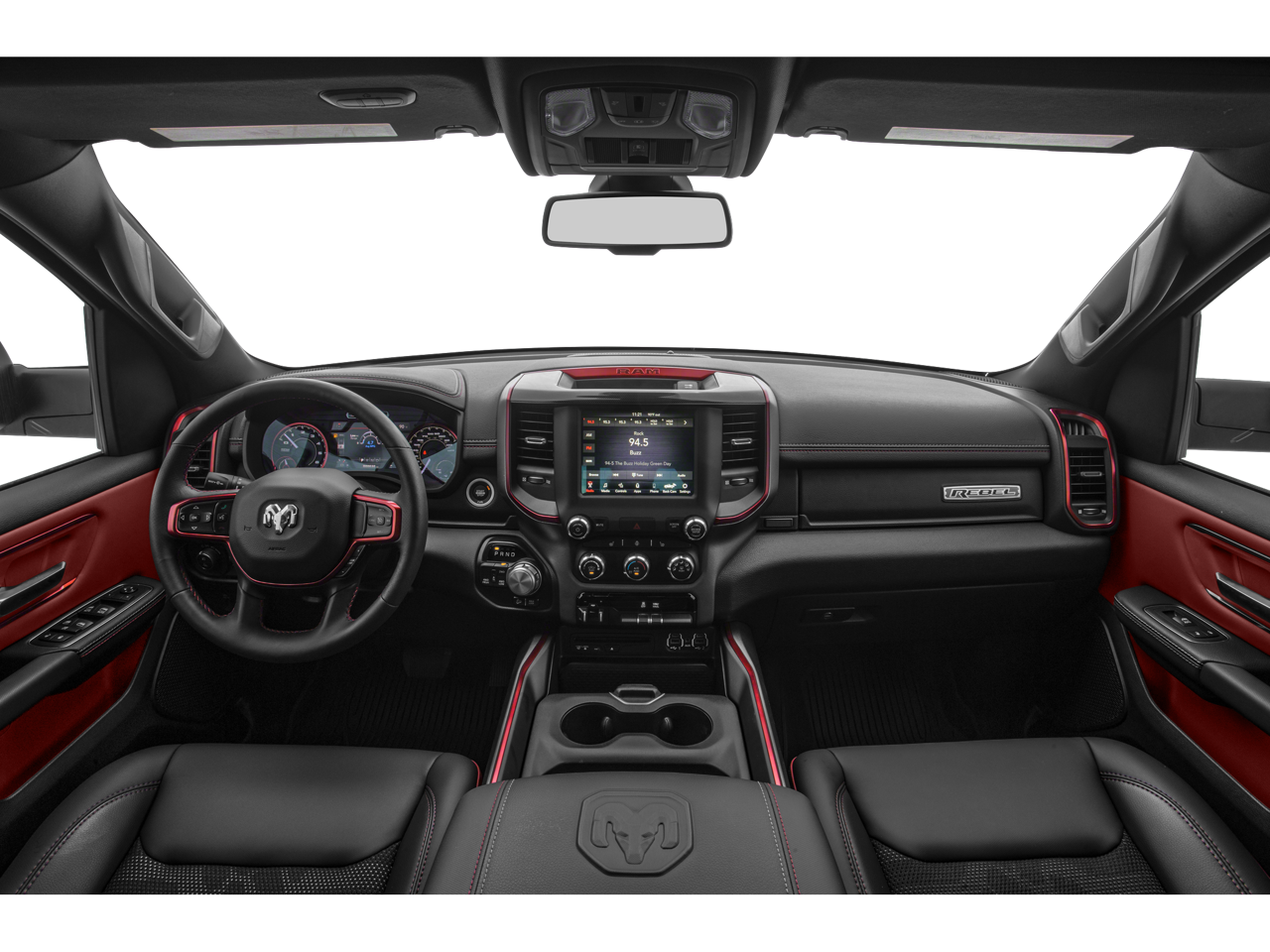 2019 Ram 1500 Rebel 3.92 Rear Axle Ratio, 4-Wheel Disc Brakes, 48V Belt Starter Generator, 6 Speakers, ABS brakes, Air Conditioning, Alloy wheels, AM/FM radio: SiriusXM, Body Color Door Handles, Brake assist, Cloth/Vinyl Low Back Bucket Seats, Compass, Delay-off headlights, Driver door bin, Dual front impact airbags, Dual front side impact airbags, Electronic Stability Control, Front anti-roll bar, Front Bucket Seats, Front Center Armrest w/Storage, Front fog lights, Front reading lights, Front wheel independent suspension, Fully automatic headlights, GPS Antenna Input, Heated door mirrors, Illuminated entry, Leather steering wheel, Low tire pressure warning, Manufacturer's Statement of Origin, Occupant sensing airbag, Outside temperature display, Overhead airbag, Overhead console, Panic alarm, ParkView Rear Back-Up Camera, Passenger door bin, Passenger vanity mirror, Power door mirrors, Power driver seat, Power steering, Power windows, Quick Order Package 23W Rebel, Radio data system, Radio: Uconnect 3 w/5 Display, Rear anti-roll bar, Rear seat center armrest, Rear step bumper, Remote keyless entry, SiriusXM Satellite Radio, Speed control, Split folding rear seat, Steering wheel mounted audio controls, Tachometer, Telescoping steering wheel, Tilt steering wheel, Traction control, Trip computer, Variably intermittent wipers, Voltmeter, Wheels: 18 x 8 Painted Black.