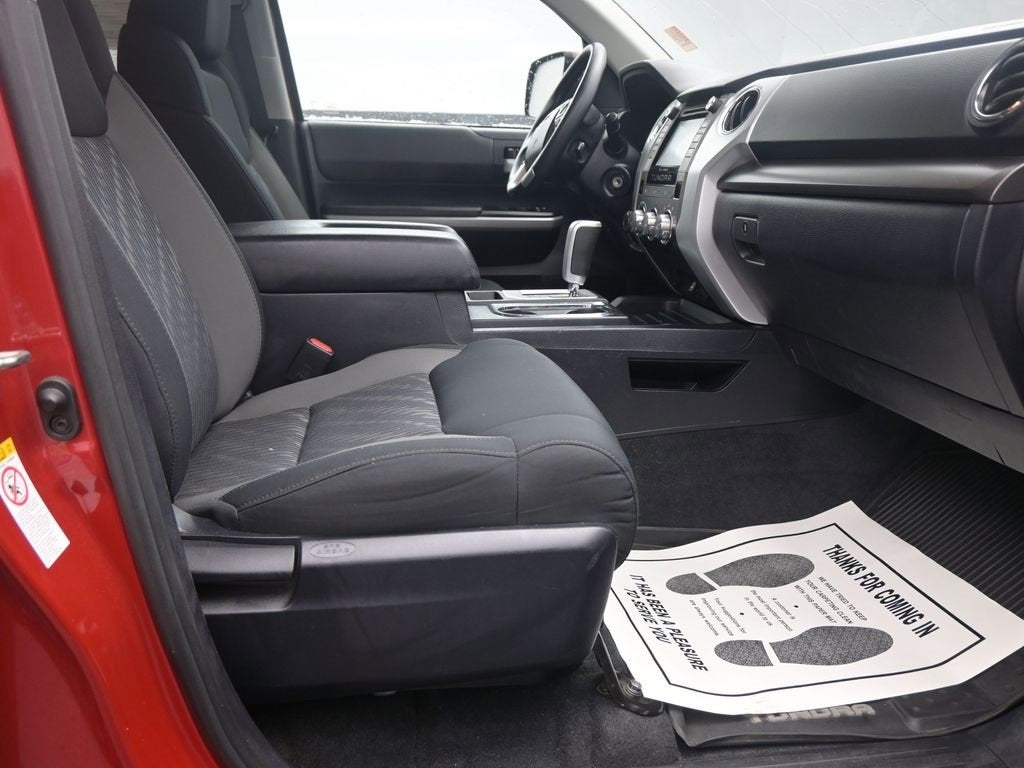 Red 2019 Toyota Tundra SR5 CrewMax 4WD 6-Speed Automatic Electronic i-Force 5.7L V8 DOHC 32V LEV 4WD, Black Cloth, 18 x 8J Styled Steel Wheels, 3-Passenger Front Bench Seat, 38 Gallon Fuel Tank Capacity, 4-Wheel Disc Brakes, 4.30 Axle Ratio, 6 Speakers, ABS brakes, Air Conditioning, AM/FM radio: SiriusXM, Anti-Theft Immobilizer w/Alarm, Auto High-beam Headlights, Auto-Dimming Rear-View Mirror, Auto-dimming Rear-View mirror, Brake assist, CD player, Compass, Deck Rail System, Delay-off headlights, Driver door bin, Driver vanity mirror, Dual front impact airbags, Dual front side impact airbags, Electronic Stability Control, Exterior Parking Camera Rear, Fabric Seat Trim, Front anti-roll bar, Front Bucket Seats, Front Center Armrest w/Storage, Front fog lights, Front reading lights, Front wheel independent suspension, Fully automatic headlights, Garage door transmitter: HomeLink, Heated door mirrors, HomeLink Universal Transceiver, Illuminated entry, Knee airbag, Leather Shift Knob, Low tire pressure warning, Occupant sensing airbag, Outside temperature display, Overhead airbag, Overhead console, Panic alarm, Passenger door bin, Passenger vanity mirror, Power door mirrors, Power steering, Power windows, Radio: Entune Audio Plus AM/FM/HD Radio w/CD, Radio: Entune Premium Audio AM/FM w/HD Radio & CD, Rear reading lights, Rear seat center armrest, Rear step bumper, Rear window defroster, Remote keyless entry, Speed control, Speed-sensing steering, Split folding rear seat, Tachometer, Tilt steering wheel, Traction control, TRD Shift Knob, Trip computer, Variably intermittent wipers, Voltmeter, 4WD, Black Cloth.