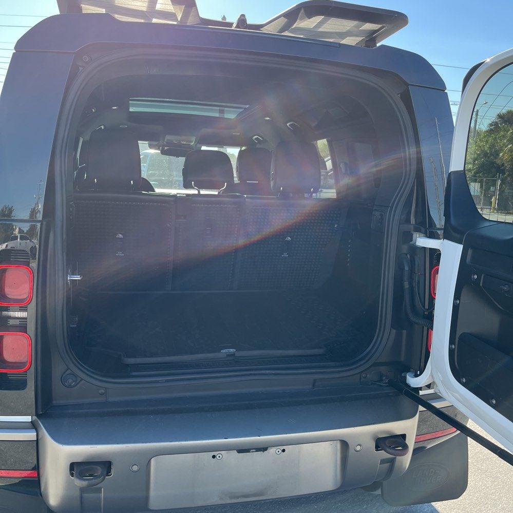 2021 Land Rover Defender 110 X-Dynamic SE 11 Speakers, 12-Way Electric Memory Seats, 3.55 Axle Ratio, 4-Wheel Disc Brakes, ABS brakes, Adaptive suspension, Air Conditioning, Alloy wheels, AM/FM radio: SiriusXM, Apple CarPlay & Android Auto, Auto High-beam Headlights, Auto tilt-away steering wheel, Auto-dimming door mirrors, Auto-dimming Rear-View mirror, Automatic temperature control, Brake assist, Bumpers: body-color, Compass, Delay-off headlights, Driver door bin, Driver vanity mirror, Dual front impact airbags, Dual front side impact airbags, Electronic Stability Control, Four wheel independent suspension, Front anti-roll bar, Front Bucket Seats, Front Center Armrest, Front dual zone A/C, Front fog lights, Front reading lights, Fully automatic headlights, Garage door transmitter: HomeLink, Grained Leather Seat Trim, Heated door mirrors, Illuminated entry, Leather Shift Knob, Leather steering wheel, Low tire pressure warning, Memory seat, Navigation system: Connected Navigation PIVI Pro, Occupant sensing airbag, Outside temperature display, Overhead airbag, Overhead console, Panic alarm, Passenger door bin, Passenger vanity mirror, Power door mirrors, Power driver seat, Power passenger seat, Power steering, Power windows, Radio data system, Radio: 400W 11 Speaker Meridian Sound System, Rain sensing wipers, Rear anti-roll bar, Rear fog lights, Rear reading lights, Rear seat center armrest, Rear window defroster, Rear window wiper, Remote keyless entry, Roof rack: rails only, Security system, Speed control, Speed-sensing steering, Speed-Sensitive Wipers, Split folding rear seat, Steering wheel memory, Steering wheel mounted audio controls, Tachometer, Telescoping steering wheel, Tilt steering wheel, Traction control, Trip computer, Variably intermittent wipers, Weather band radio.